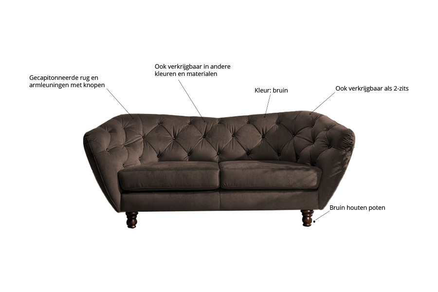 Bank Venetie driezits heeft een vintage uitstraling. Deze Chesterfield bank is uitgevoerd met een gecapitonneerde rug en armleuningen met knopen. De bank is leverbaar met bruin houten poten of chromen poten. Dat ligt dus net aan jouw smaak en voorkeur. Venetie is leverbaar in diverse kleuren stof of lederlook.De klassieke interieur stijl is een stijl die niet bij iedereen geliefd is, maar die door sommigen zeer gewaardeerd wordt. Deze bank valt daar ook onder. Dit is een echte blikvanger in jouw woonkamer. Toch kun je deze bank ook combineren met een modern interieur. Bij een gecapitoneerde bank wordt een stof of stuk leer als bekleding geknoopt of genaaid op een vaste ondergrond. Dit gebeurt zo, dat tussen het stof en de ondergrond een laag van kussentjes ontstaat. Hierdoor krijgt het vaak een vintage uitstraling en lijkt deze bank karakter uit te stralen, terwijl hij gloednieuw is. Toch liever een iets kleinere bank? Ga dan voor Venetië 2-zits bank.