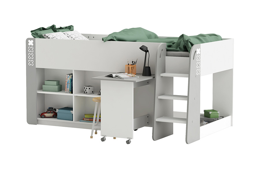 Dit superhandige kinderbed wil je hebben! Met heel veel opbergruimte, zorg je dat de kinderkamer altijd netjes en opgeruimd is. Daarnaast zit er een bureau bij, wat super handig is voor huiswerk. Wit is daarnaast makkelijk te combineren, maar oogt ook rustig. Of je nu voor een rustig palet gaat, of felle prints op je dekbedovertrek: alles kan! Met deze hoogslaper bespaar je ruimte in de kinderkamer, omdat de ruimte onder de hoogslaper óók benut kan worden.