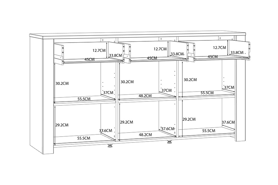 Het dressoir Bohol is uitgevoerd met drie laden en drie kastjes en heeft dus veel opbergruimte.