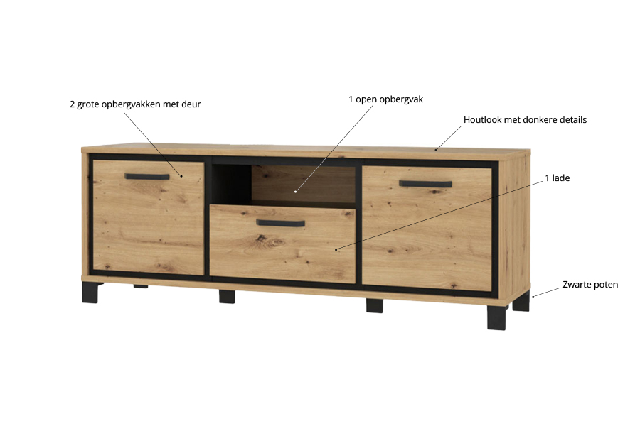 Dit mooie, industriële tv-meubel is industrieel en robuust. Het tv-meubel Trondheim bestaat uit drie vakken en één lade. Zo heb je veel opbergruimte en plek voor apparatuur. Omdat het tv-meubel op poten staat is er minder stofophoping en kun je makkelijk poetsen onder het meubel. Naast dit prachtige en handige tv-meubel zijn er meerdere meubels beschikbaar in deze industriële serie. Zoals een vitrinekast, eettafel, dressoir en een salontafel. We hebben ook een complete woonkamer geselecteerd voor je, zodat je alle meubels in dezelfde serie kunt aanschaffen, voor een mooie prijs. Shop dit tv-meubel nu online of in een van de woonwinkels van WOONENZO.