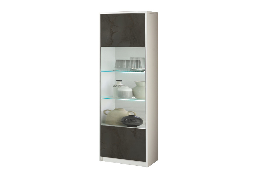 De vitrinekast Giada is een stijlvol en modern meubelstuk dat perfect past in elk modern interieur. Het is uitgevoerd in een elegante kleurencombinatie van wit met grijs oxide.De vitrinekast heeft een glazen deur en is voorzien van 2 glazen legplanken met led-verlichting, wat zorgt voor een mooie uitstraling en verlichting van je favoriete items. Met een hoogte van 180 cm en een breedte van 60 cm biedt de kast voldoende ruimte om de spullen op een stijlvolle manier tentoon te stellen.