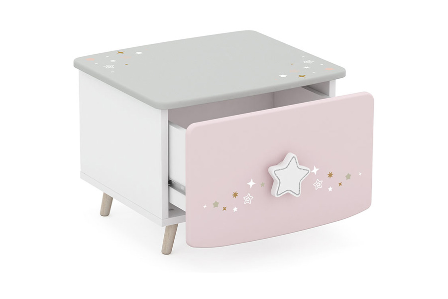 Kinder nachtkastje Ster is perfect voor alle prinsessen en feeën onder ons! Door de leuke decoratie met sterren, kan jouw dochter haar fantasie helemaal de loop laten. Kindernachtkastje Ster heeft een lade voor opbergruimte, ideaal dus voor wanneer jouw dochter d'r haarelastiekjes wil opbergen. Of wanneer ze klaar is met haar sprookjesboek. Zo houd je de kamer netjes en opgeruimd. Dit kinder nachtkastje is echt perfect voor een meisjeskamer, door de kleuren en de vrolijkheid. Niemand gaat in deze slaapkamer verdrietig naar bed!