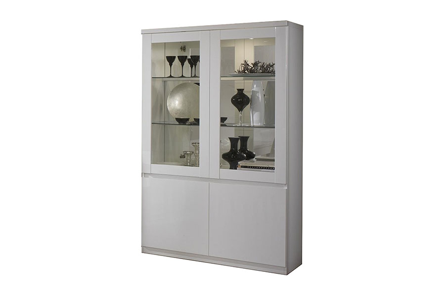 Vitrinekast hoogglans wit Mora is een moderne vitrine van Italiaans design. Het bovenste gedeelte van de kast heeft glazen deurtjes met daarachter ook glazen legplanken. Ideaal voor alle spullen die je graag uit wil stallen. De achterzijde van de kast is voorzien van een spiegel, hierdoor krijgt de kast meer diepte. Het onderste gedeelte van de vitrine Mora bestaat uit draaideuren met daarachter één legplank. Hier kun je spullen die je graag op wil bergen kwijt. Zo houd je jouw woonkamer of eetkamer ordelijk. Deze vitrinekast komt inclusief verlichting. Geeft het een extra chique look. In de collectie Mora zijn onder andere een eettafel, salontafel, dressoir en commode beschikbaar. Kijk hier voor onze gehele collectie vitrinekasten.